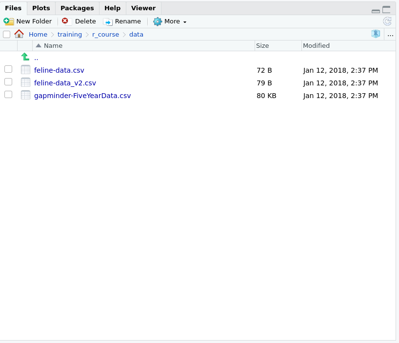 Copy the files gapminder-FiveYearData.csv, feline-data.csv, and feline-data_v2.csv files from the zip file you downloaded as part of the lesson set up to the data/ folder within your project. We will load and use these files later in the course.